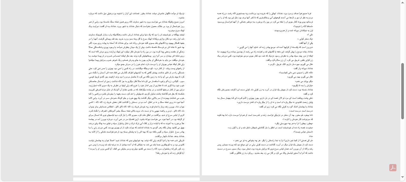 > “لبخند بچگانه و خوشبخت او را دید که یکدنیا برای خداداد ارزش داشت و هنگامیکه وارد بازار دماوند شد، اول رفت دکان بزازی و یکدانه لچک سرخ با گل و بته سبز و زرد خرید بعد قند و چائی گرفت، آنها را در بغچه قلمکار پیچید و با گامهای بلند بسوی کلبه خودش روانه شد…”
