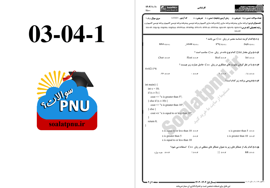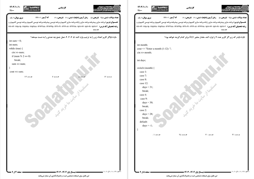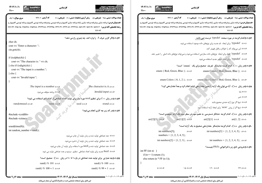 بخشی از کتاب نمونه سوالات برنامه‌سازی پیشرفته دانشگاه پیام نور