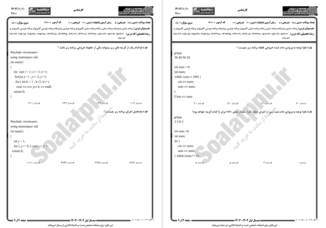کتاب نمونه سوالات برنامه سازی پیشرفته دانشگاه پیام نور PDF